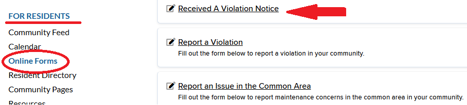 To dispute a fine or fee you received, request a hearing with the Board of Directors, or request an extension of time to bring the property into compliance, you will need to fill out a Board Review form. Please call or email our office for access to the form.